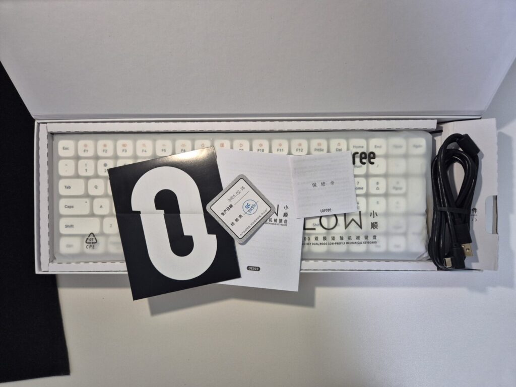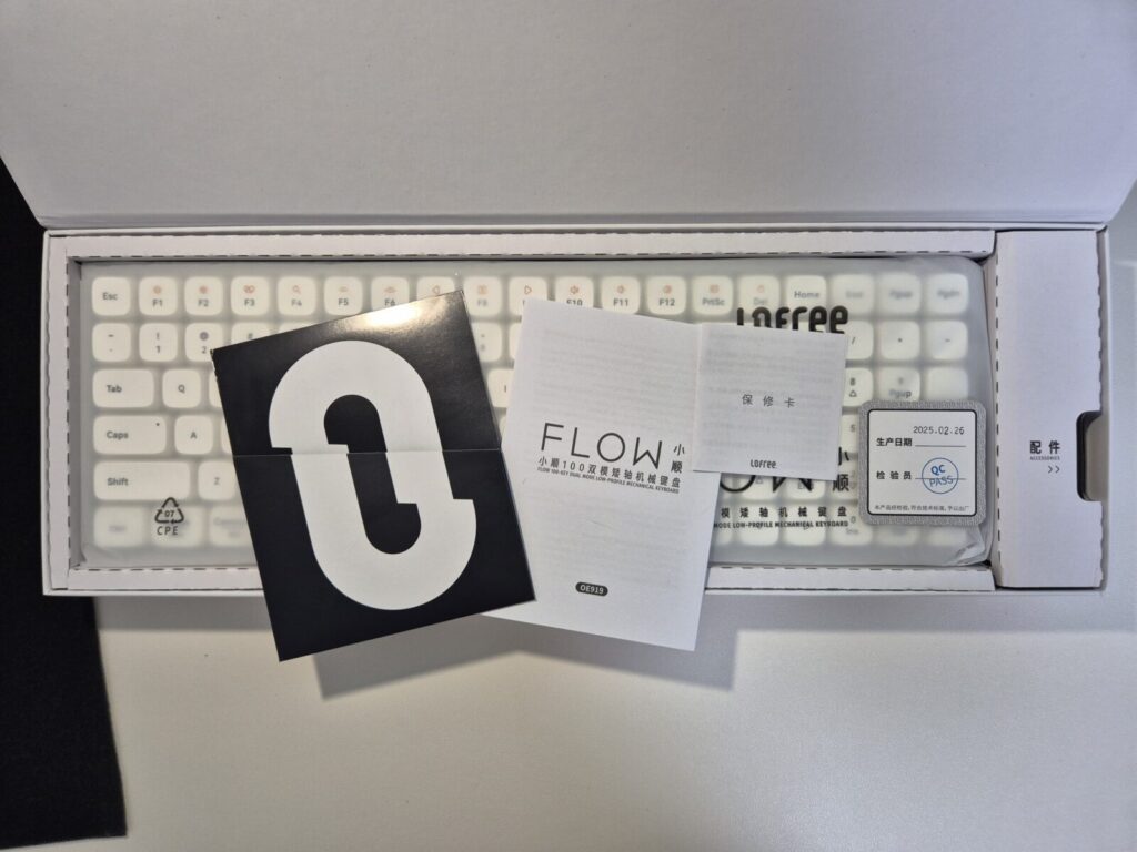 로프리 플로우100 키보드는 반짝이는 포장지에 싸여 있으며, 외관부터 고급스럽고 세련된 인상을 줍니다. 박스를 열면 키보드 본체, 보증서, 사용 설명서, QC 품질보증서가 깔끔하게 정리되어 있고, USB-A to USB-C 케이블도 함께 제공되어 유선 연결이나 충전 시 유용하게 사용할 수 있습니다.