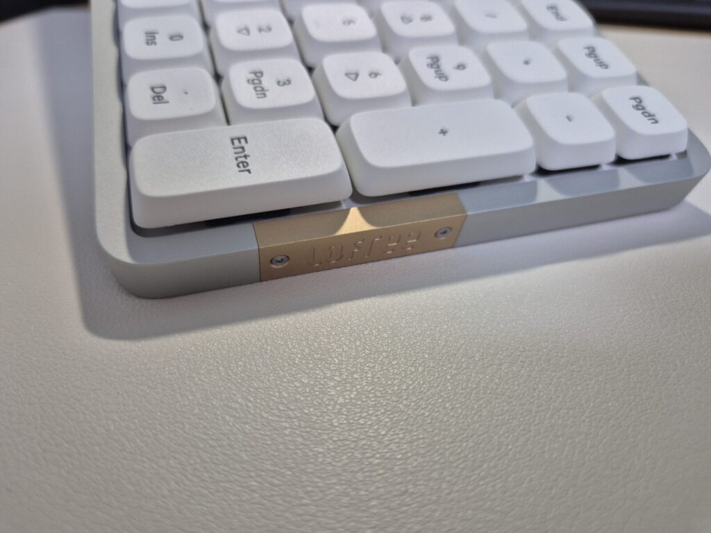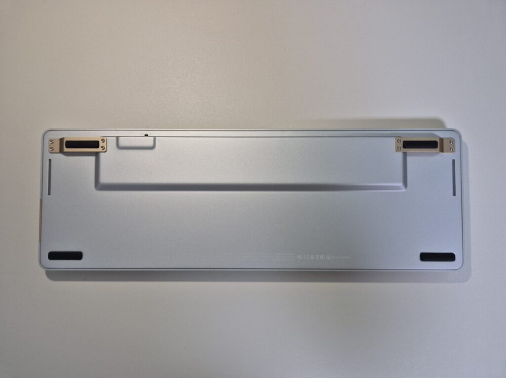 로프리 플로우100 키보드는 투명 보호필름으로 한 번 더 포장되어 있으며, 숫자 키패드를 포함한 풀 배열 구조임에도 불구하고 전반적으로 컴팩트한 인상을 줍니다. 뒷면은 알루미늄 합금 소재로 견고하게 제작되었고, 나사 조립의 정밀도가 높아 마감 완성도가 우수합니다.
