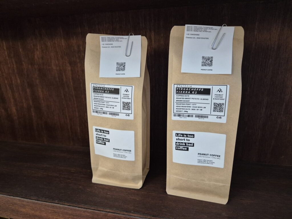 포장에는 로스팅 책임자, 연락처와 QR코드, 피넛커피 브랜드 소개까지 꼼꼼히 기재되어 있어 신뢰를 더했습니다.